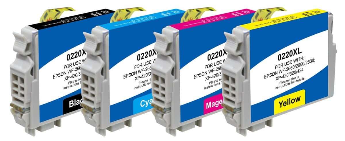 Premium ISO-Certified Epson 220 Compatible Inkjet Printer Cartridges. High Yield Black, Cyan, Magenta, and Yellow compatible ink cartridges for Epson inkjet printers; an economical generic alternative to the genuine Epson product.